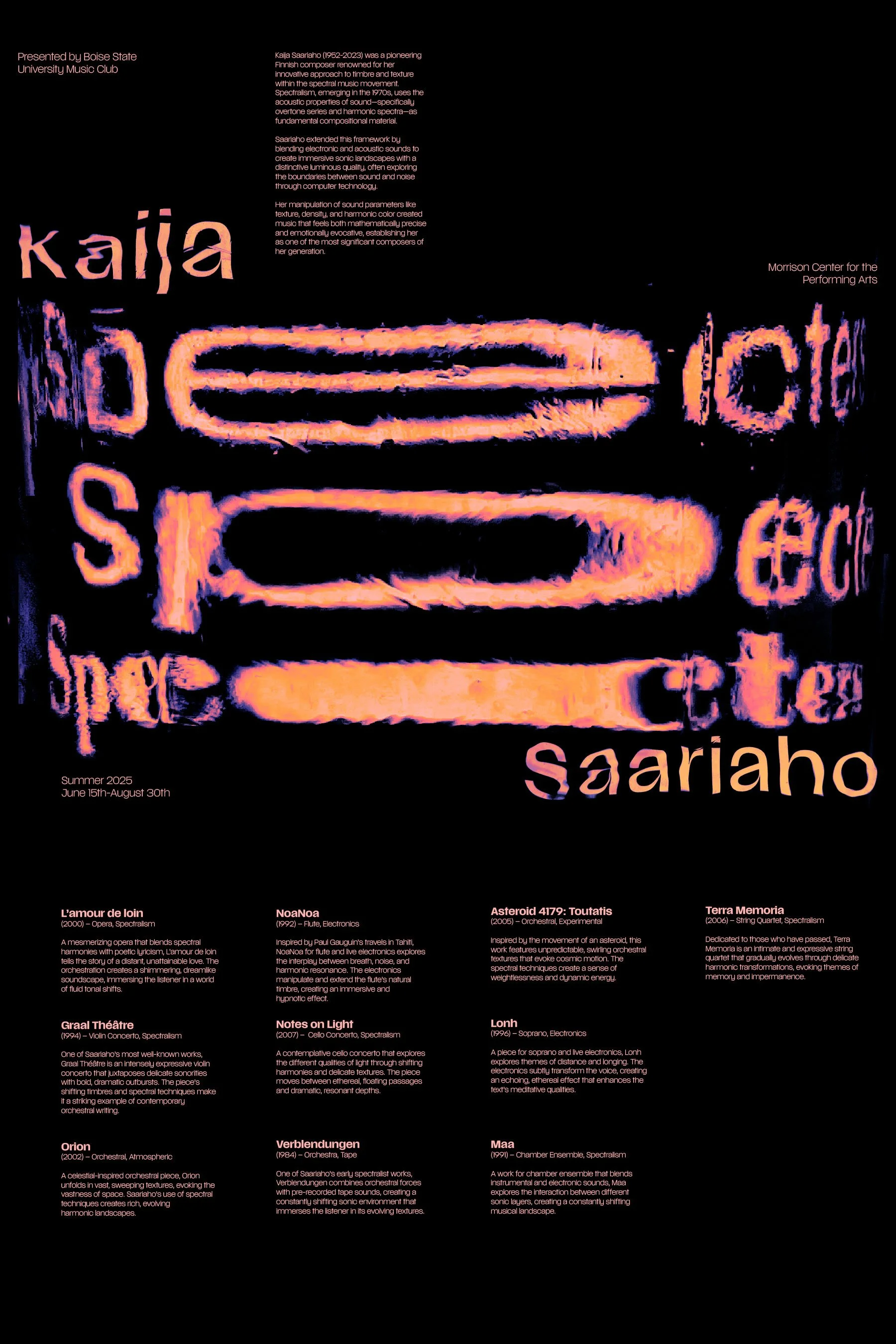 For this conceptual Classical music poster, I used several novel processes and techniques to generate a functional design that communicates the tonal style of Finnish composer Kaija Saariaho, known for pioneering the Spectralism genre.